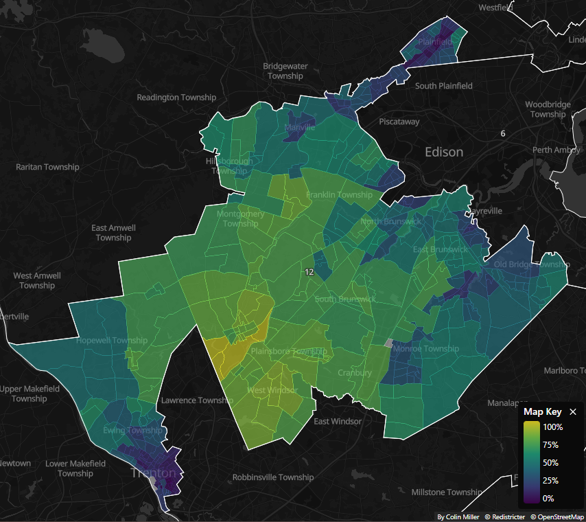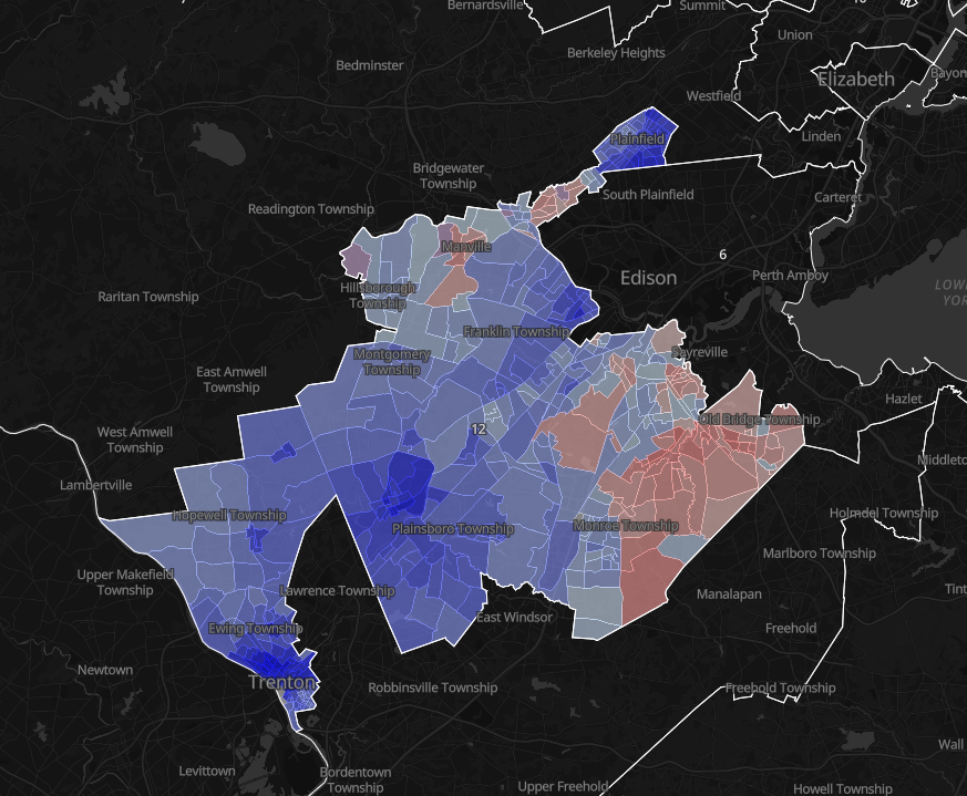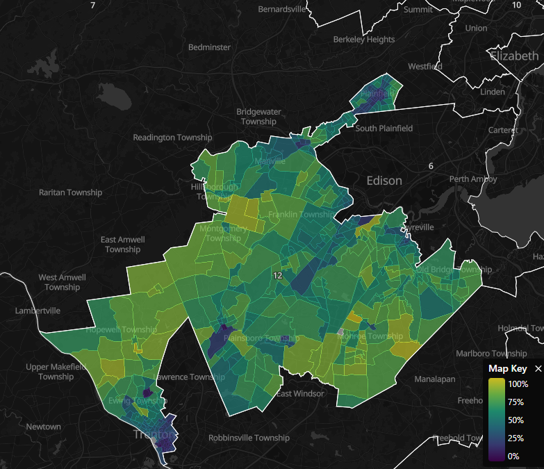 NJ-12 is a diverse district, with every major ethnicity comprising at least 15% of the district. The urban areas in Plainfield and Trenton are mostly Black and Hispanic, which leads us back to turnout rates. Generally, Black and especially Hispanic areas tend to have lower turnout than average, while White areas tend to have higher turnout. Asian areas, consisting mostly of South Asians, are concentrated in the central and southern parts of the district, in areas like Plainsboro Township and South Brunswick. The non-white areas also are where Democrats get most of their votes from, and why it’s consistently voted Democratic in the Trump era. However, there was a 10% shift towards Trump from 2020-2024, as seen in many non-white areas across the country.