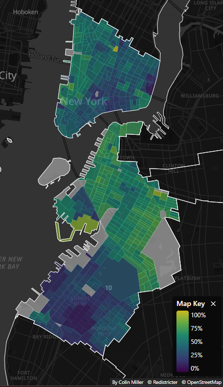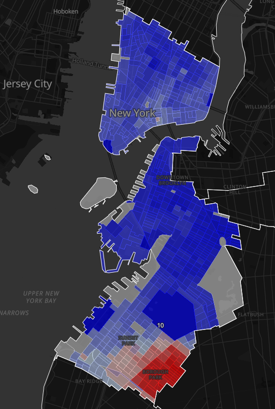 Turnout here is well below average, due to a variety of factors that will be explained below. The southern part of Brooklyn has extremely low turnout (some parts only reach 20%).