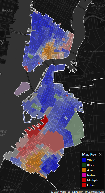 As you might expect in a district that includes Lower Manhattan, the district is majority college-educated, and about a quarter of people have a graduate’s degree. The areas that are most educated are those affluent White areas, and the areas that are least educated are those Asian and Hispanic areas in the district. This is in contrast to NJ-12, where the most educated areas of the district were Asian. The average yearly income is also well above average, but the poverty rate is below average as well. Sadly, education and income are highly correlated, so while the White areas are quite wealthy, the non-white areas are quite poor.