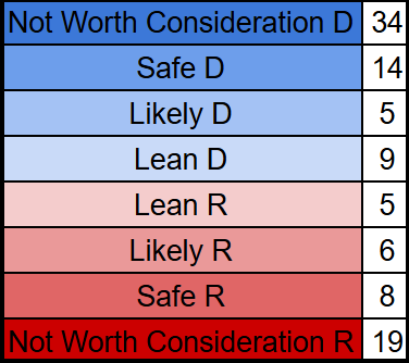 We will not be including any toss-ups in our ratings, because we could just put all the close seats in that category, and that’s really not too interesting. Our four ratings for each side will be Lean, Likely, Safe, and Not Worth Consideration.