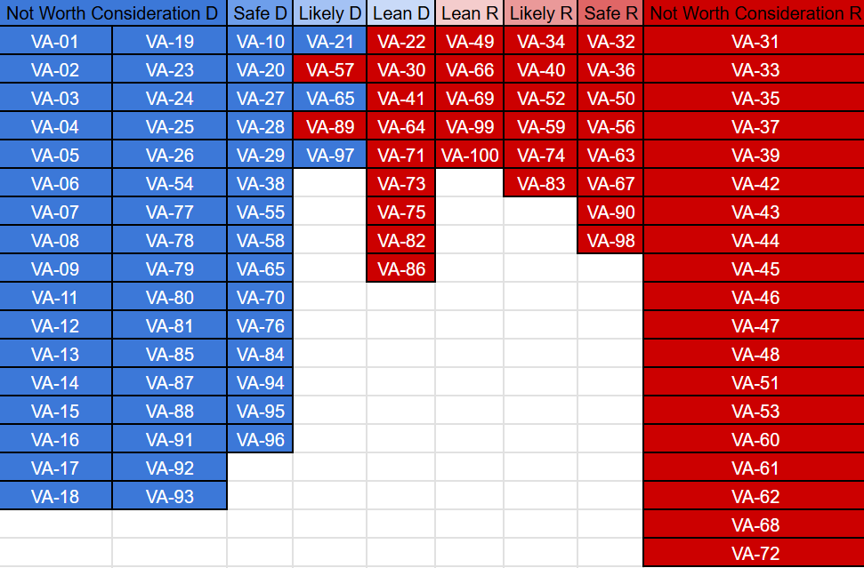 While the Governor’s, Lt. Governor’s, and Attorney General races are getting most of the attention in Virginia, we wanted to take some time and talk about the House of Delegates election. The House of Delegates is made up of 100 members, and similarly to the federal House of Representatives, they are all up for re-election every 2 years. In the last Governor’s election in 2021, not only did Glenn Youngkin win and flip the Governor’s Mansion, but Republicans gained the majority in the House of Delegates from the Democrats. In 2023, Democrats regained their majority, albeit a 51D-49R majority. In 2025, Youngkin is not allowed to run for re-election, as Governors can only run for one term at a time in Virginia. While winning the Governor’s race is very important for both parties, it can also have big consequences for downballot races… like the House of Delegates. In this piece, we’ll go over each “competitive seat”, and give our ratings for how each race might go.