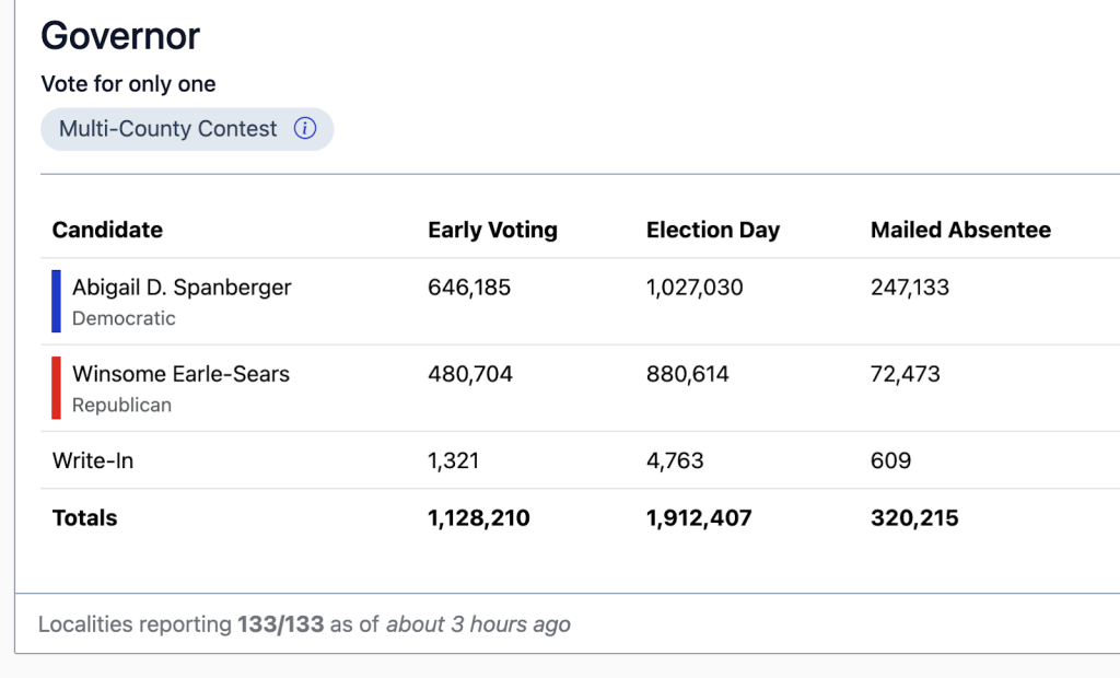 In Virginia, the overall turnout remained high; we don’t have full results, but I’d estimate the turnout was close to 2021’s 55%, give or take 1-2% either way. Winsome Earle-Sears got more votes than Ralph Northam in 2017, but lost by more than 15%. What was shocking was that Democrats were the clear beneficiaries of differential turnout, or what campaigns refer to as “get the vote out”. In this case, it’s not a factor of overall turnout, but whether a marginal Dem voter is going to show up vs. the marginal Republican voter. Unlike 2024 in Virginia, the marginal voters were more likely to be Democrats, and the results speak for themselves.