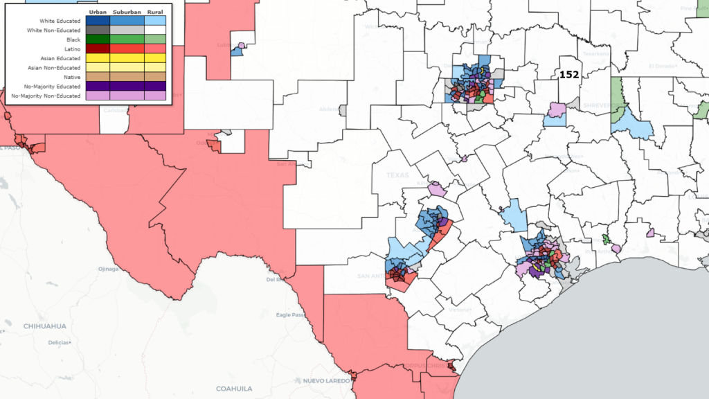 On the map are percentages, each one representing the percentage of the vote in 2024. Just as an example, the Dallas metro represented 27.4% of all the votes cast in Texas, and the Austin metro represented 9.4% of all votes. “Everything else” represented about 26.4% of the vote, and even if it won’t be that much of the Democratic primary vote, it will still be a significant amount. That whole area, including TX-152, is white, rural, and non-college educated. It is, however, not completely white, with about a third of people living in TX-152 being either Black or Hispanic, and it’s these voters that will likely decide how “everything else” votes.